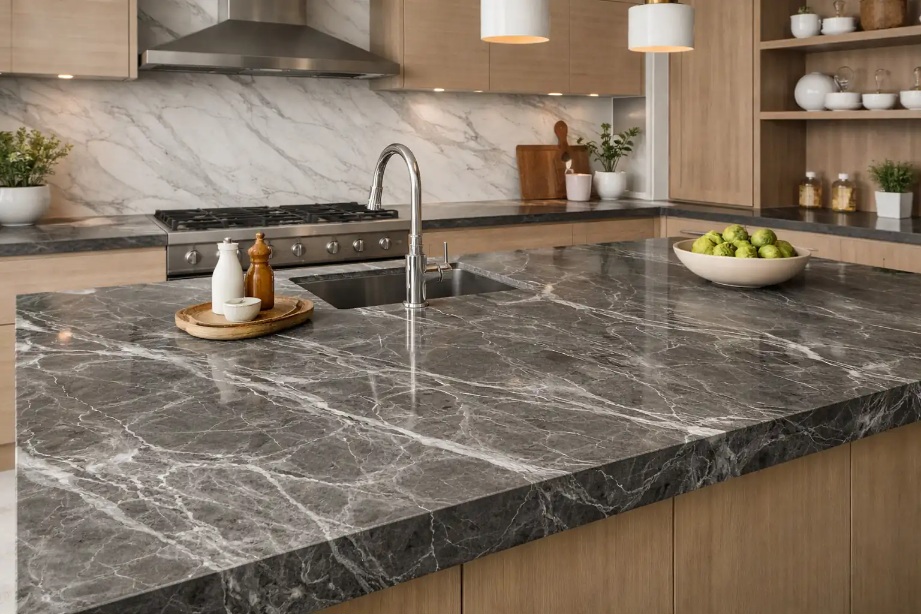 Renk yapısı açısından bakıldığında Lamar French Grey, düz gri yüzeylerden farklı olarak hafif hareketli bir doku sunar. Bu detay, özellikle geniş tezgah alanlarında tekdüze görüntüyü kırarak daha doğal ve derinlikli bir görünüm elde edilmesini sağlar. Açık ton ahşap dolaplarla sıcak bir kontrast yaratırken, antrasit ve siyah yüzeylerle birlikte kullanıldığında daha modern ve keskin bir stil ortaya çıkar.